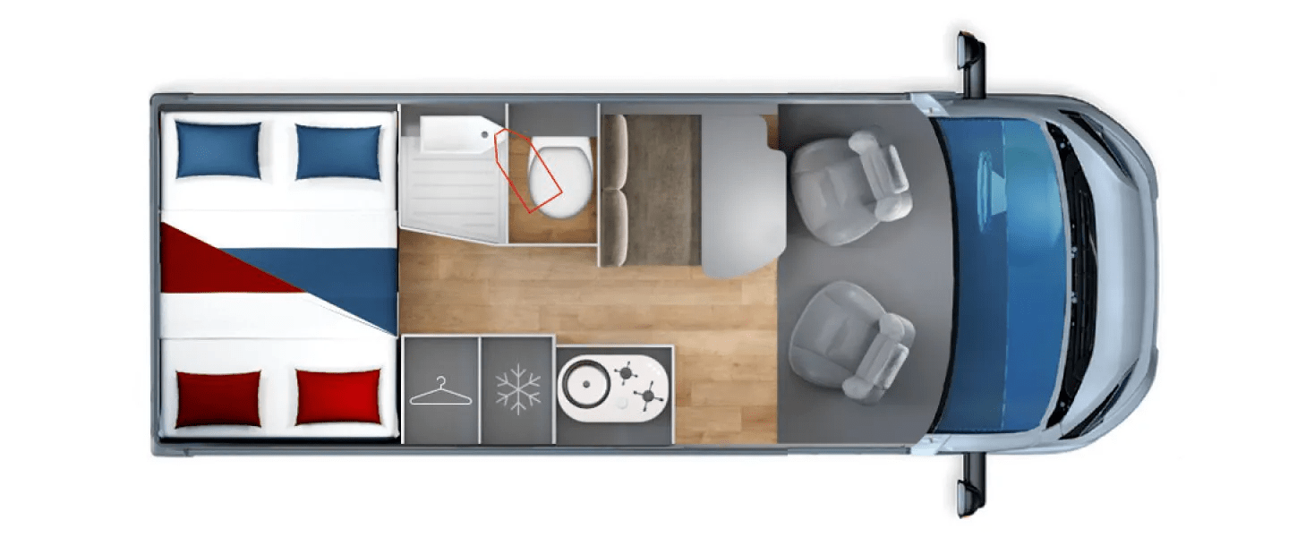 La autocaravana capuchina GIOTTIVAN 60 B es un amplio modelo familiar con 6 plazas para dormir y 6 asientos homologados para viajar. En la parte posterior se encuentran 2 literas de 210×80 cm cada una. La zona del salón se transforma en una cama doble de 175×100 cm y dispones de otra amplia cama sobre cabina de 210×160 cm.