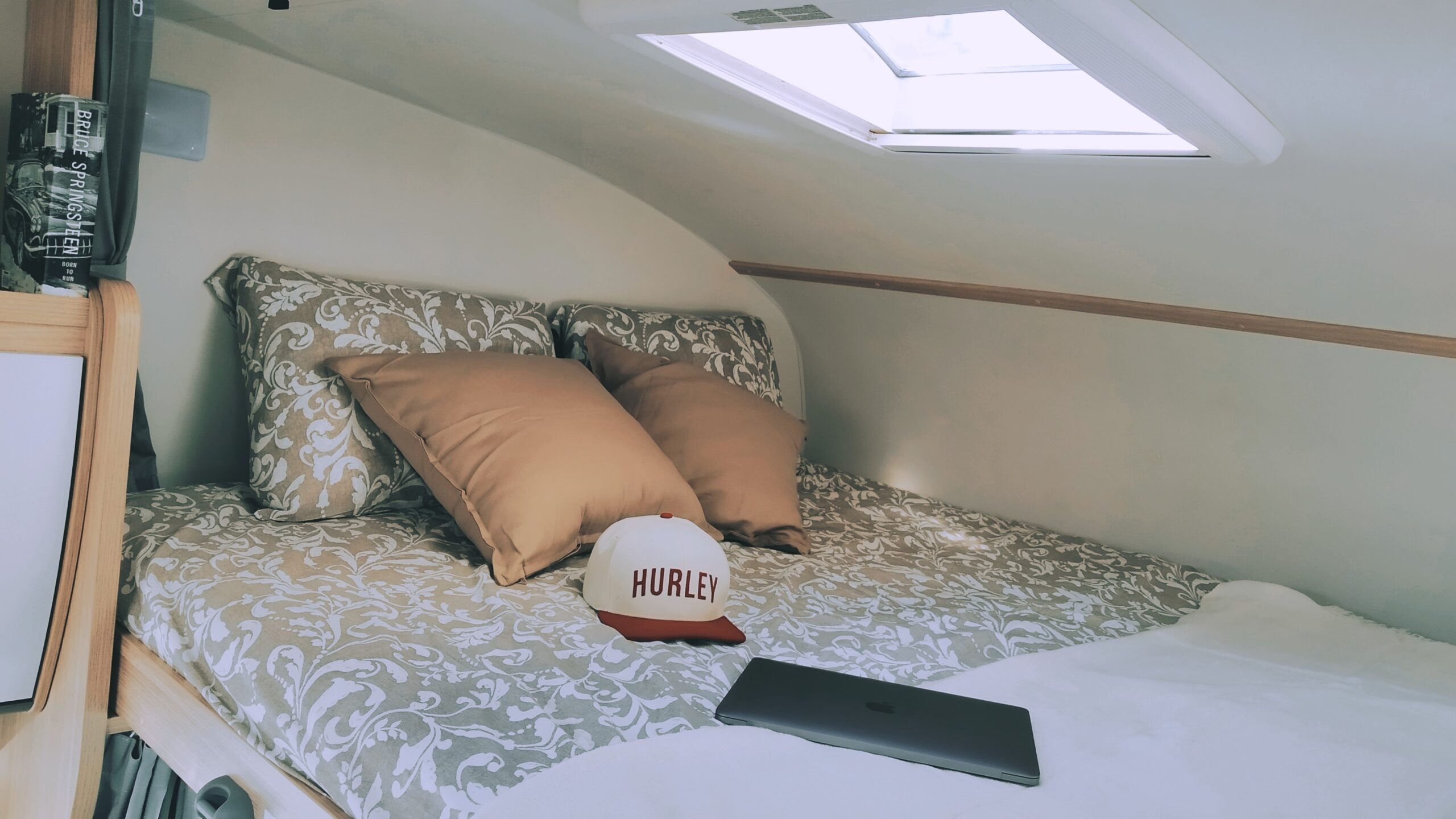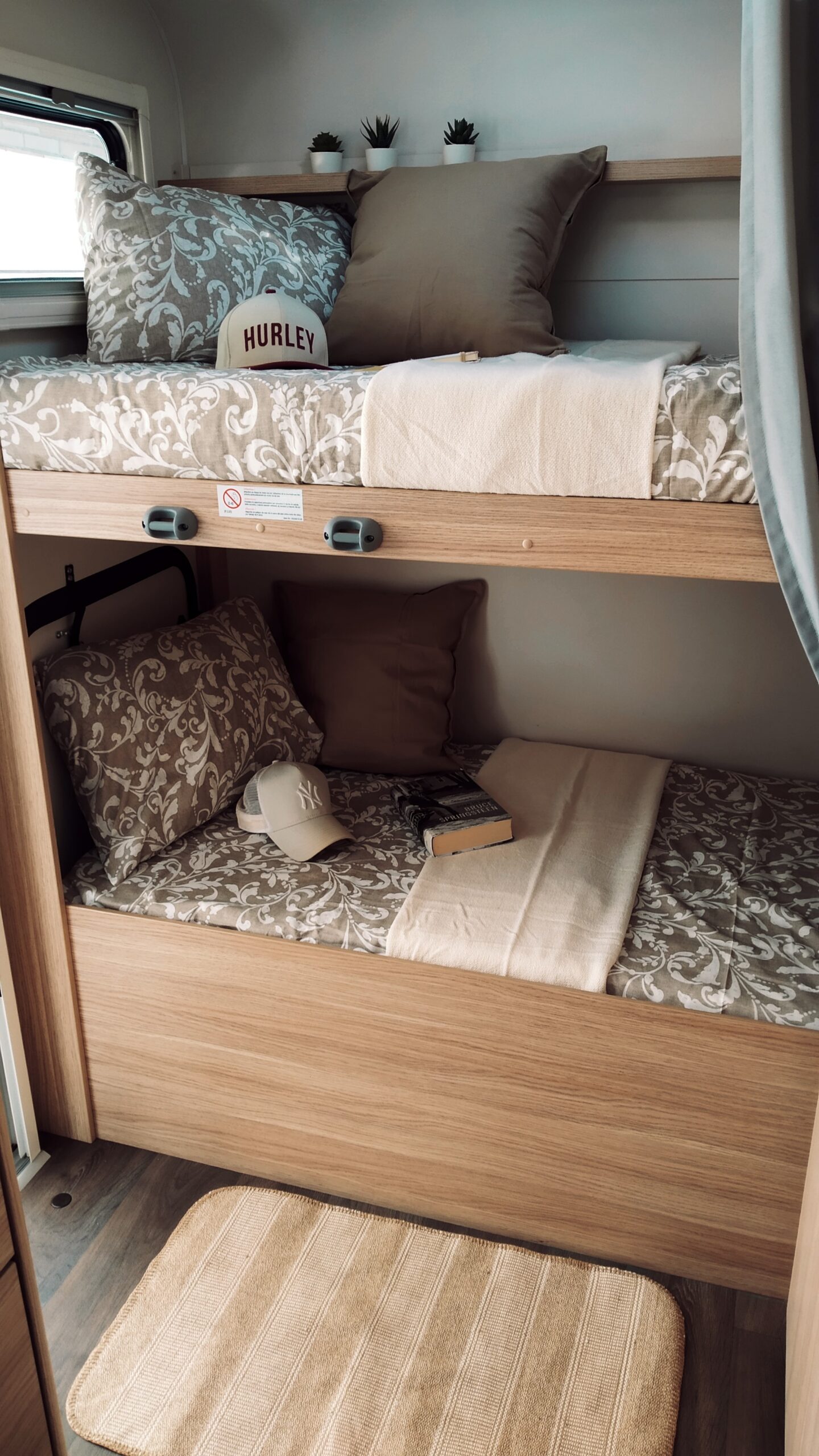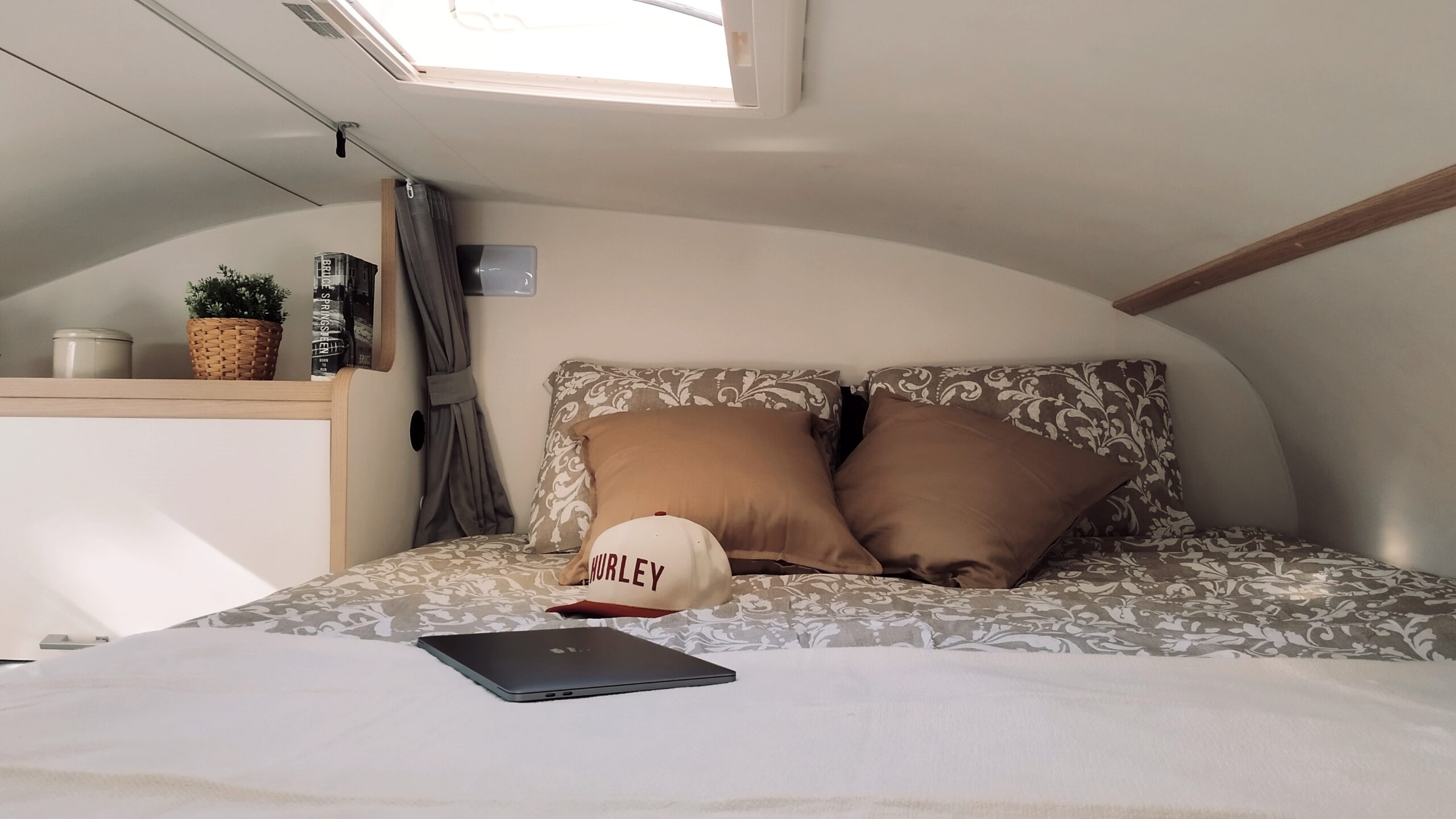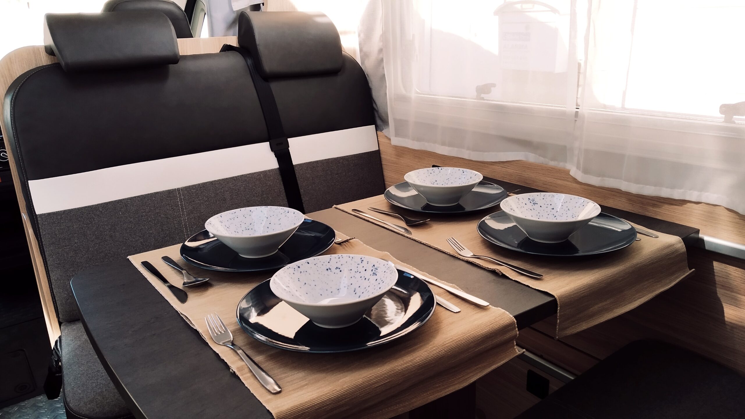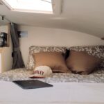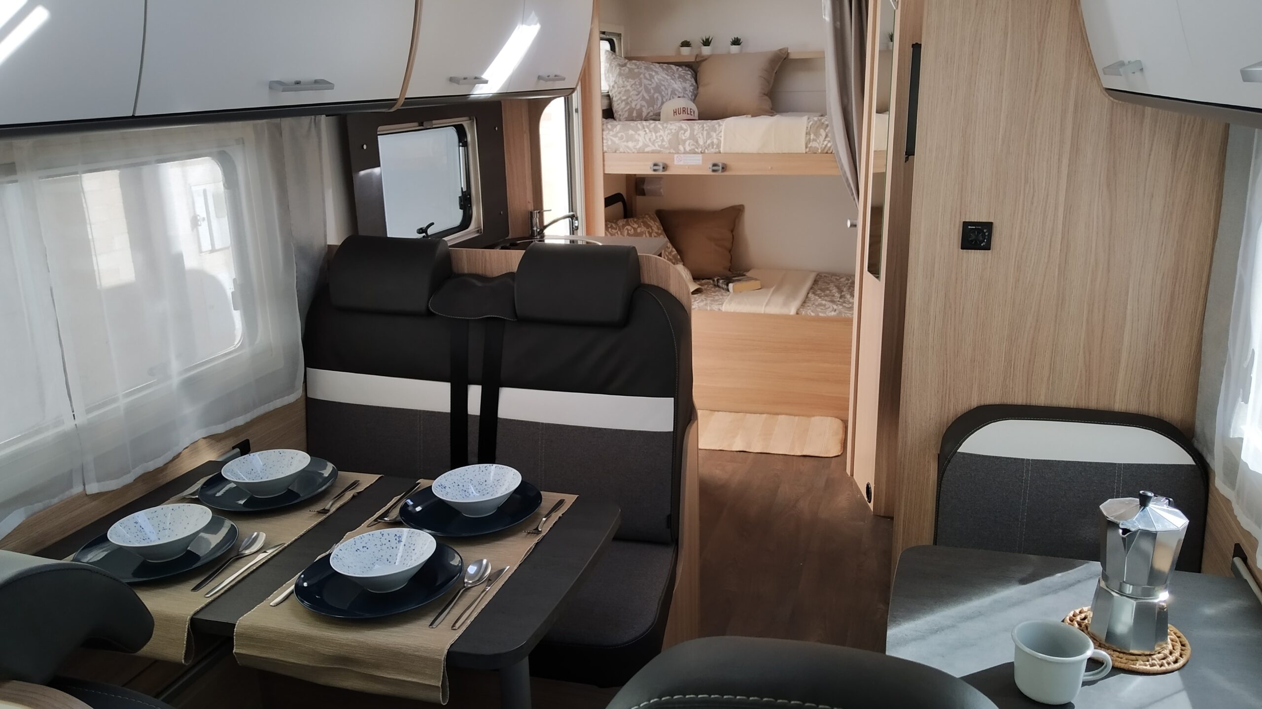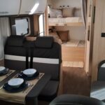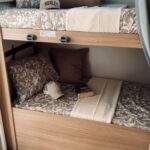 En la parte posterior se encuentran 2 literas de 210 × 80 cm cada una. La zona del salón se transforma en una cama doble de 175 × 100 cm y dispones de otra amplia cama sobre cabina de 210 × 160 cm.